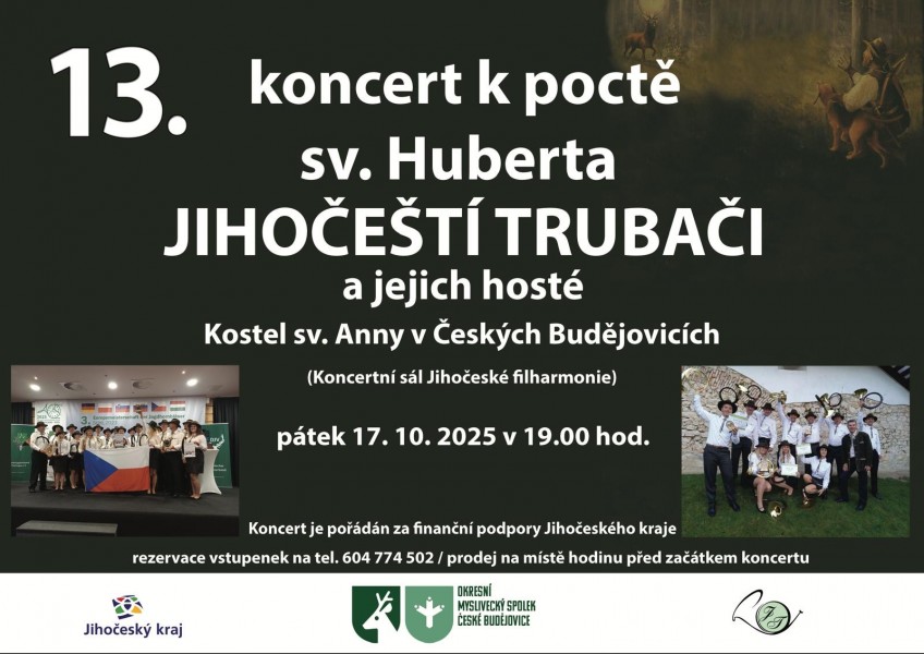 13. Koncert k poctě svatého Huberta v koncertní síni O. Jeremiáše, Č. Budějovice, od 19.30 hod. |